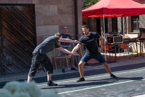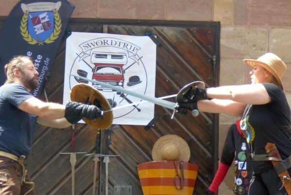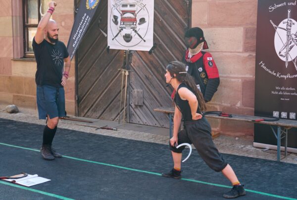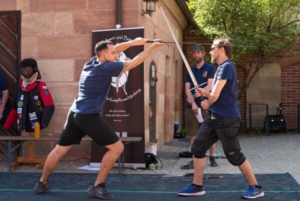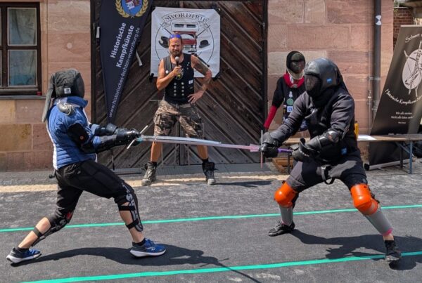 Die Verschränkung dieser beiden zentralen Aspekte wird in Nürnberg seit nunmehr über 10 Jahren von den Gruppen Schwert und Bogen, Schwertbund Nurmberg, Traditional Italian Knife Fighting und dem Swordtrip aktiv gelebt. Zu unseren Gästen zählen auch immer wieder Gruppen aus dem Nicht-Hema-Bereich, wie zuletzt dem Ken Tsuru Dojo in Fürth, die die japanische Kampfkunst “Iaido” praktizieren.